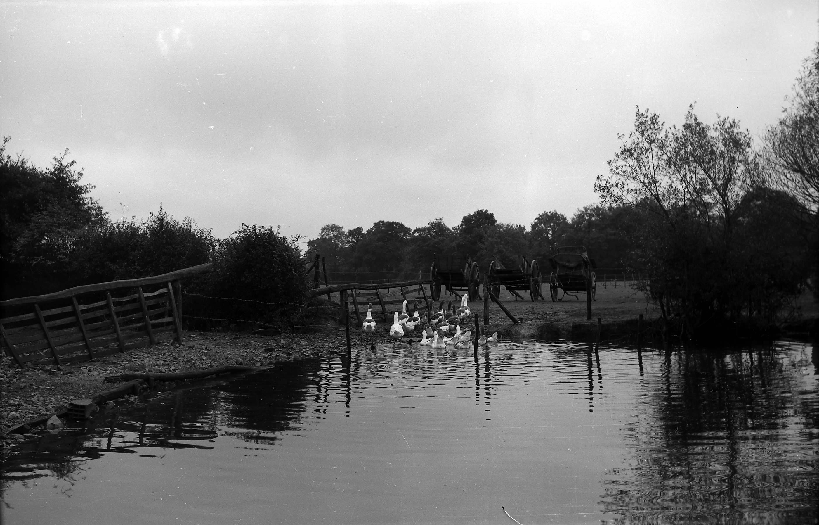 Des canards sortent d'une mare en direction d'un champ où sont rangées un tombereau, une charrette et une voiture à cheval.