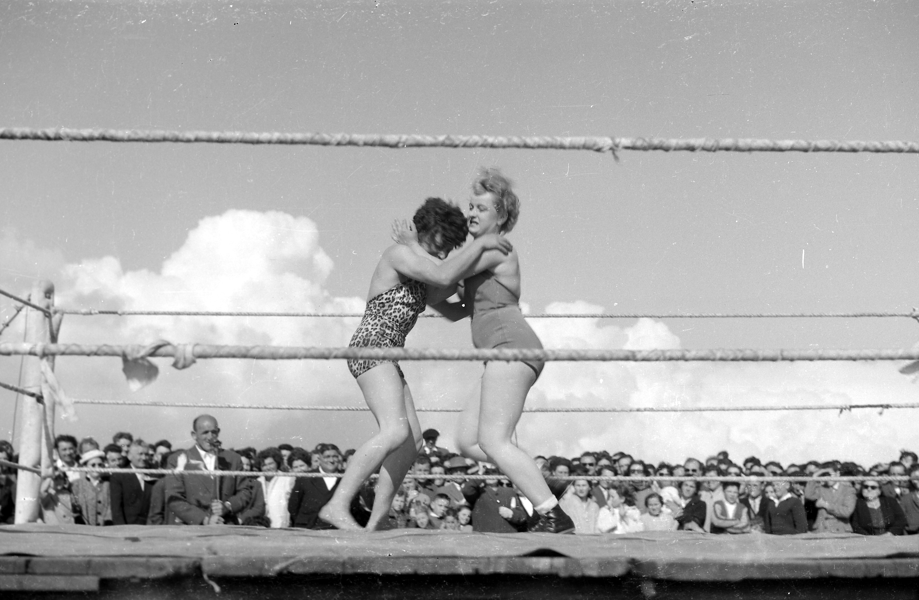 Combat de catch féminin. Le commentateur tient fermement le pied du micro. Les spectateurs observent les sportives et ne semblent pas très enthousiastes.
