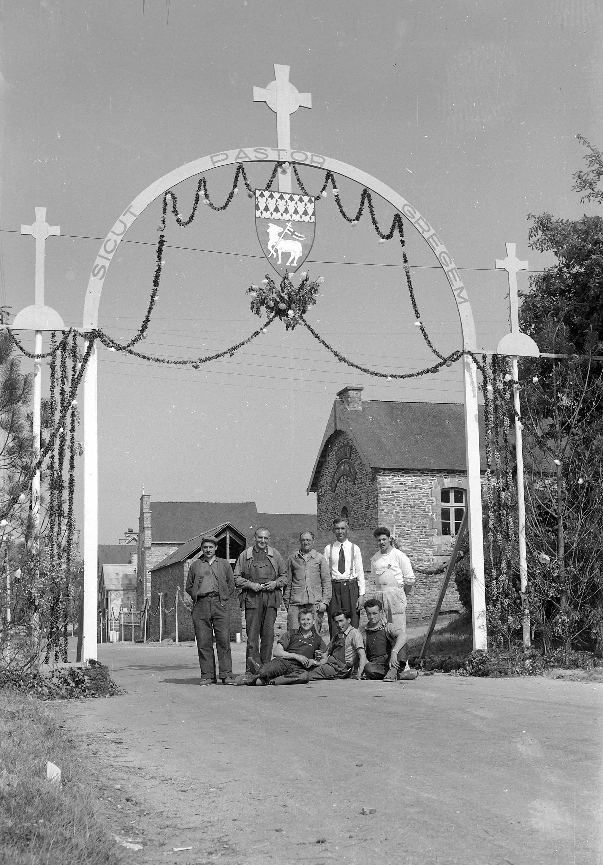 Des gaciliens pose sous l'Arc de triomphe construit rue du Menhir pour la bienvenue de l'Évêque, Mgr Bellec. L'incription «Sicut Pastor Gregem» (bon comme le berger du troupeau) est affichée au-dessus du blason qui représente l’Agneau Pascal, avec le pied droit tenant la hampe de sa bannière.