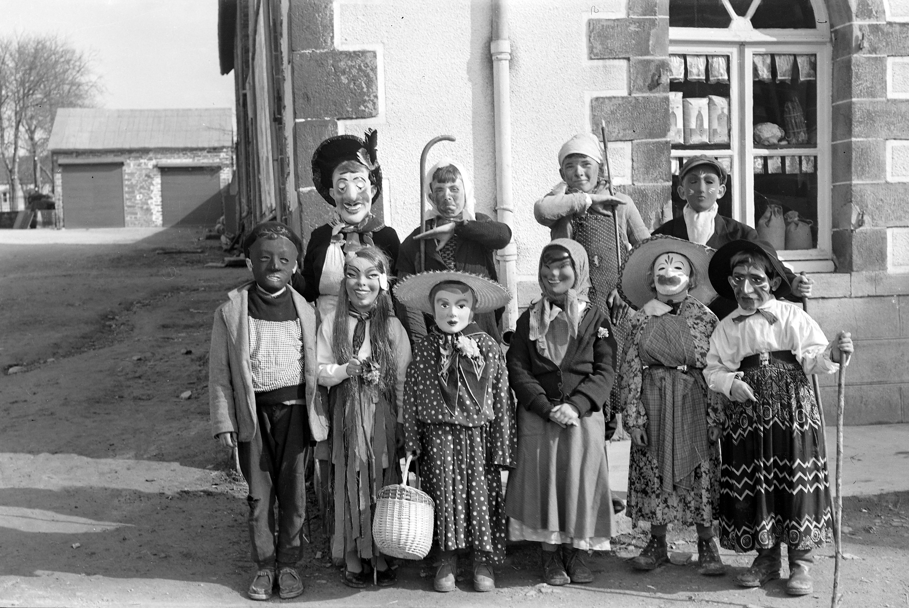 Avant de défiler pour le carnaval, un groupe d'enfants de l'école publique pose devant le magasin du grainetier « Café - Graines J. Corvaisier ».